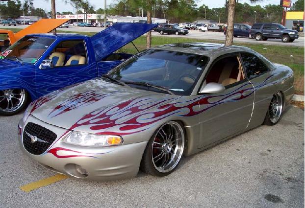 *Shaved emblems/logos *Frenched antenna *Shaved the fast and furious supra style wing *Shaved front turn signals *Wired headlights to blink *Body panels molded onto car *Shaved third brake light *Shaved stock wing *Removed plastic off trunk lid and replaced with steel *Shaved trunk lock *Shaved backup lights *Shaved body line around tag box *Shaved taillights replaced with custom made flame taillights *Custom mixed silver base with House of Kolor Candy Brandy Wine Flames *Flames hand striped in blue *Graphics run in the jams *ALL BODY & PAINT WORK DONE BY Volusia County Customs(Todd Fischer & Doug Lafland) *Painted brake calipers