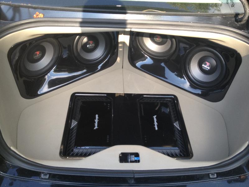 focal polyglass mids and highs.Rockford fosgate power amplifiers.4 ten inch focal subwoofers.Custom door panels and trunk area