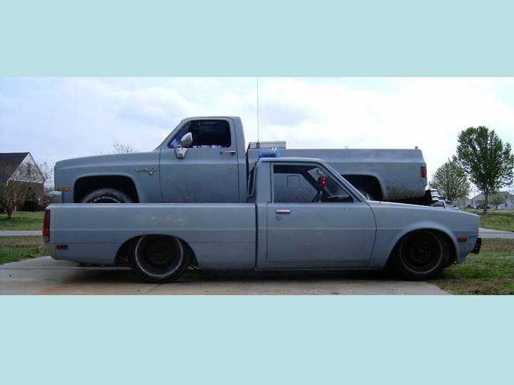 Body drop, Escalade wheels, Mighty Max front end, Suicide doors, Paint and tribal graphics, Toyota front bumper