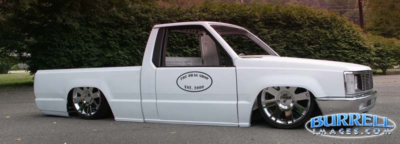 white primer with migthy max front end, billet insert in grille and bumper, shaved doorhandles and locks, cal combo, taillight fillers, and caddy lights, mirrors shaved and finally body droped 3 3/4" lays flat rockers, full 6" flatfloored sheetmetal bed shaved gas door and bed seams, suicide doors, and black rag top