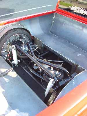 Body dropped 2-1/2 inches by Master Image Customs, fully adjustable Firestone air bags front and rear. Rear suspension constists of a narrowed Currie-built Ford 9-inch rear end, heavy duty axles, solid threaded bar stock triangualted four-link, fuel cell located in rear frame section beneath bed.