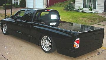 shaved door handles,taligate, gasdoor.Cowl induction hood, shaved bumper smooth roll pan, lexan back window with license insert. Chrome front valance.Winter 2002 stock floor body drop in progress, triangular 4-link already in, starting to cut..wil update with pics soon !!