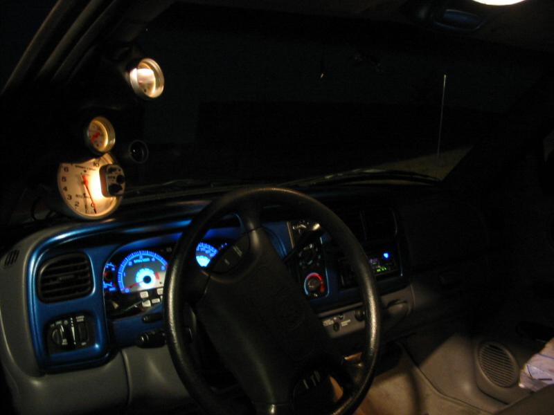 APC white face gauges with billet surround. Billet trim plates on all dash work.