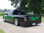 Removed factory fender flares. Shaved: all handles, third brake light, all emblems, gas door. Alter Images rollpan, molded in. Organic Green HOK flames w/ silver outline. Suncoast creations ram air hood, K&N filter. Stull billet grill w/ fiberglass shell molded into hood. Clear corners, carbon fiber euro tails. Streetscene mirrors, custom wheel tubs and, fuel door in bed.