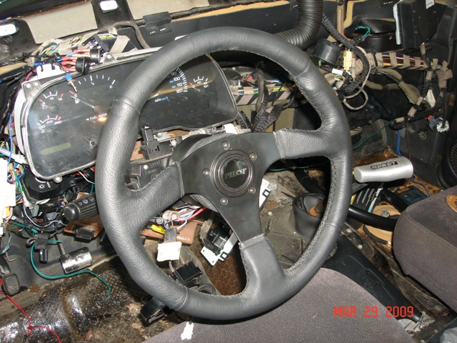 factory seats cut down, no carpet, no dash, everything zip tied to steering column :), suede headliner and leather wrapped "A" pillars done by me