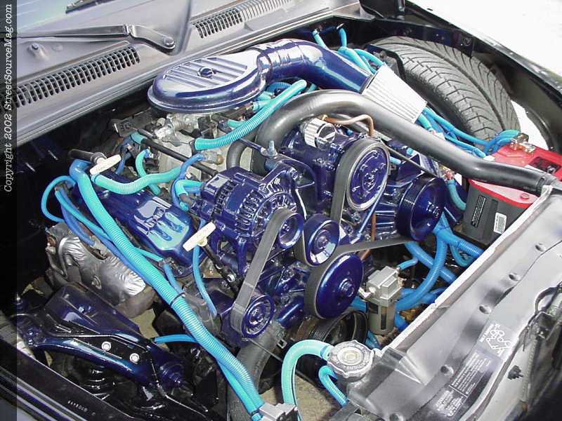 3.9L V-6 magnum w/everything painted royal blue metallic and onyx black. factory a/c compressor converted over to run airbag set-up. shaved firewall. optima battery. Airaid high flow K & N airfilter system, flowmaster exhaust. fuel cell.