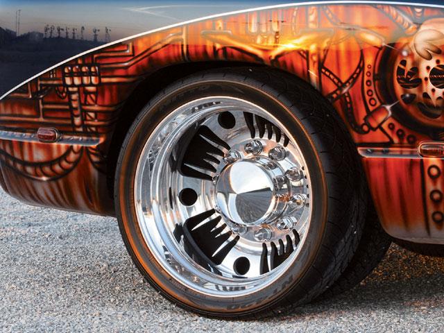 An X Klusive grille,K and S Kustom sprayed and coated the big-wheel hauler with a House of Kolor Bright Silver, Rootbeer, Tangerine, and black paint scheme and airbrushing.