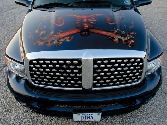 factory 5.9L 325hp Cummins turbodiesel adorned with accessories coated in House of Kolor paint. A 4-inch Flowmaster exhaust system complements the factory turbo, which features enlarged piping and runs 12 to 16 pounds of boost.