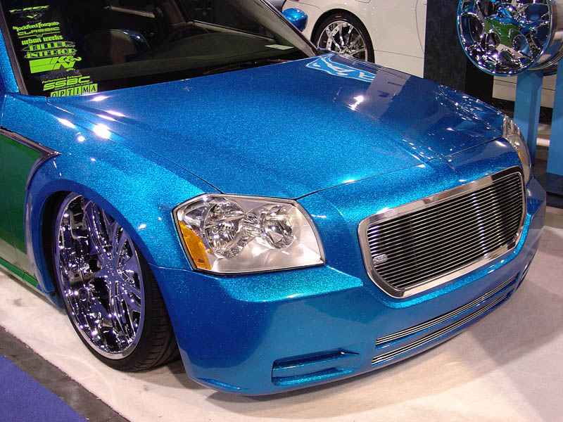 SOLD...Shaved front and rear bumper lines, front emblem, hood squirters, rear wiper, rear tailgate handle. Color changed to royal blue flake and lime time green, billet upper and lower grill, chrome divider ....Paint and body work done by John Owens. 300c chrome door handles all rear no locks. Grunions fabrication cut the car to lay flat