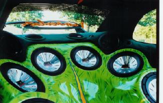 Molded door panels with MTX carved out, custom made speaker box fit to my body, painted fiberglass, neon’s, tweed, vinyl, chrome fire-extinguisher, Water Aquarium