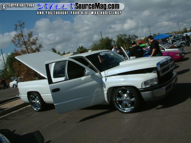 EXTERIOR: FINE SATIN BLUE PEARL PAINT (BLUISH AND PURPLISH), COWL INDUCTION HOOD, BILLET GRILL (TOP AND BOTTOM), EURO CORNERS, XENON BULBS ALL THE WAY AROUND, GAYLORDS TONNEAU COVER, SS MIRRORS, SHAVED TAILGATE HANDLE AND BODYLINE ON TAILGATE, EURO TAILLIGHTS, ROLLPAN, BED CARPET KIT, 22” KATANA IMAGES WRAPPED IN GOODYEAR WRANGLER F1 RUBBER, BAGGED W/SLAM SPECIALTIES BAGS, ½” LINE, VI-AIR COMPRESSOR AND TANK, AND LIMO TINT.