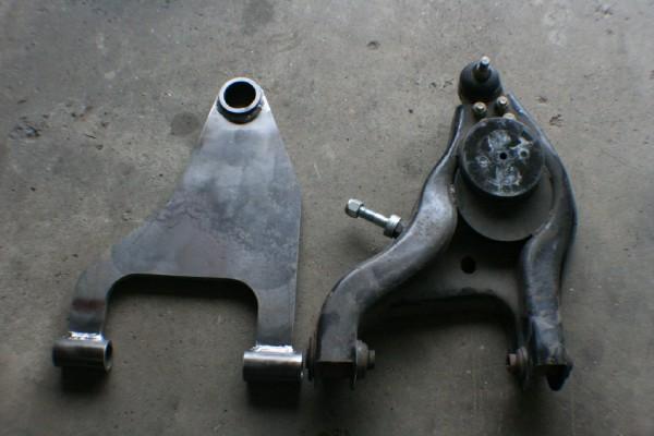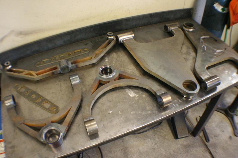 *4 link with a Watts link, Z'd ,Upper and Lower Control Arms with a steering kit to narrow up the front end
