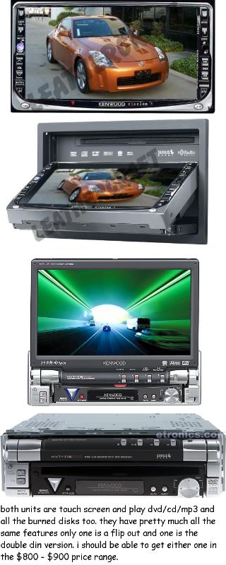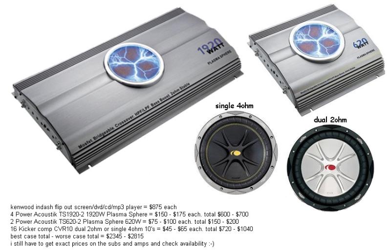 PANASONIC 7300U 7 INCH FLIP OUT SCREEN WITH BUILT IN DVD.CD.MP3.CDRW PLAYER, FOSGATE POWER 1501BD, CLARION 60x4, 4 POWER 12''S IN CUSTOM MADE CENTER CONSOLE DONE BY MIND TO METAL CUSTOMS AND THE REAR SEAT HAS BEEN SPLIT FOR THE BOX TO GO FROM DASH TO REAR WINDOW, ALL CERWIN VEGA HIGHS 6x9''S UP FRONT AND 5 1/4 IN BACK ,CROSS OVER,AND OF COURSE PLAYSTATION 2 ,VIPER ALARM WITH ALL 4 WINDOW CONTROLS AND REMOTE TURN ON FOR THE RADIO , WILL UPDATE PICS SOON