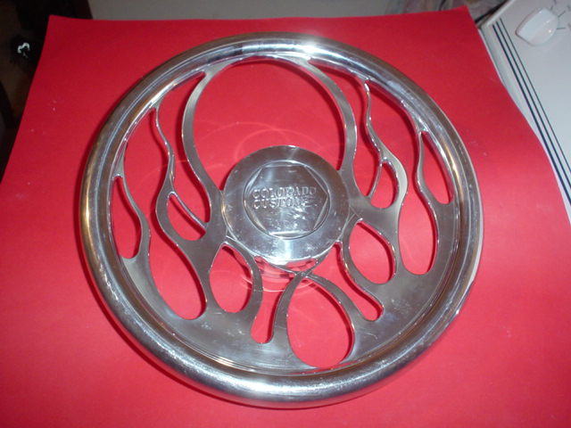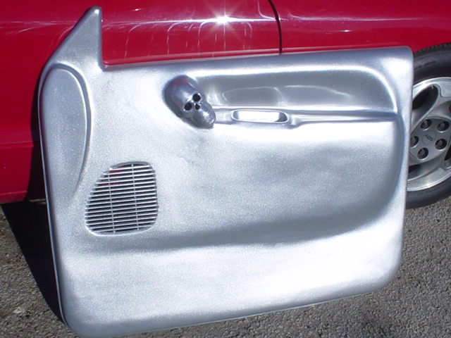 Custom fiberglass door panels with skulls, fiberglassed headliner also with skulls, Smoothed out dashboard and every single plastic piece sprayed, Red & silver bucket seats, Custom Tribal Flame tint, Trenz flamed mirror, Trenz flamed pedals, Colorado Customs Flamed steering wheel