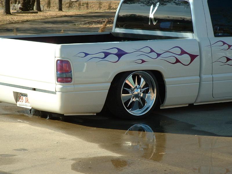 Haraquin Flames,White base with blue pearl,Shaved:handles,tailgate handle and bodyline, antenae, bed stakes, gas lid, roll pan; phantom bumber with fog lights,rhino liner.