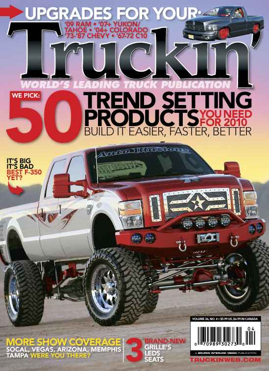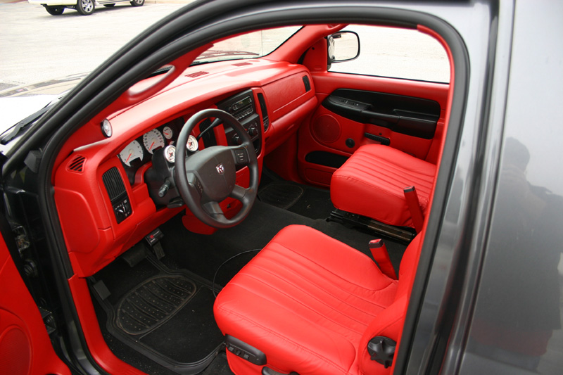 trans gauge in the pillar, air gauges on the column, & brake controller flushed under dash, red leather seats, headliner, & cab wall, all plastics dyed flame red