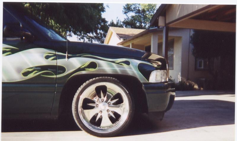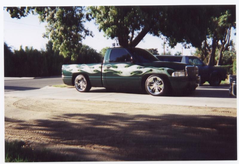 FULL TINT,RAM TAIL LIGHT COVERS, CLEAR CORNERS, ROLL PAN,STREET SCENE BUMPER W/SPEED GRILLE BUMPER INSERTS,CHROME GRILLE W/SPEED GRILLE INSERTS, FOREST GREEN, W/ STERLING METALLIC SILVER TRIBAL/TRADITIONAL FLAMES AND NEON GREEN PIN STRIP.