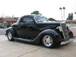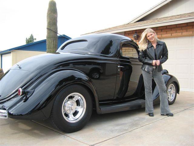 Top / 2.5” chop, with 48 Ford Coupe top used to fill in, by M. Roads Horns / Spare-tire removed, Bitchin Products firewall and floor-pan, PPG Concept DCC 9000 Black, 35’ Ford taillights modified