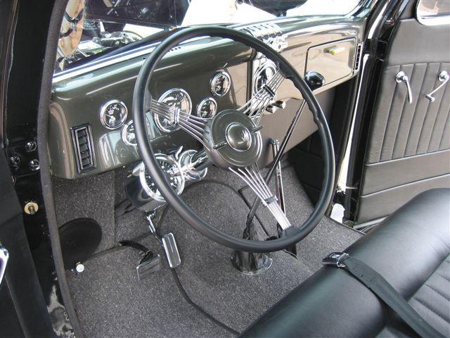 MoonEyes Collector Series guages, Vintage Air, 1ST Upholstery in Tempe, AZ did the interior, Black leather seat / door panels, German square weave wool / gray carpet,