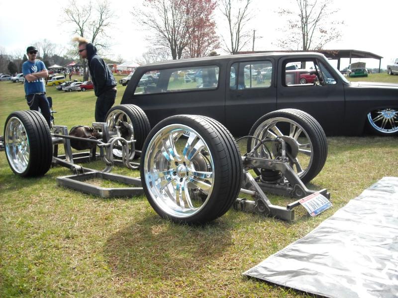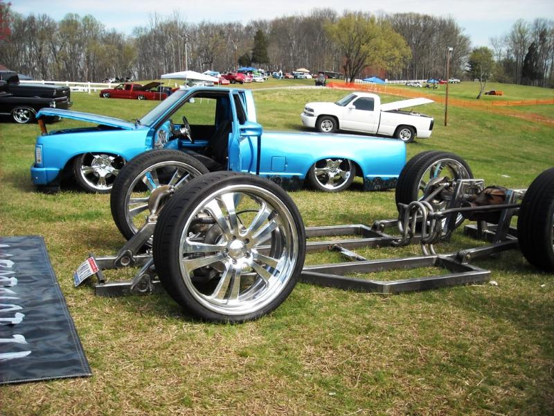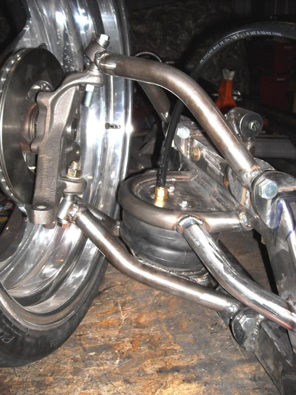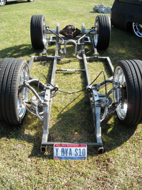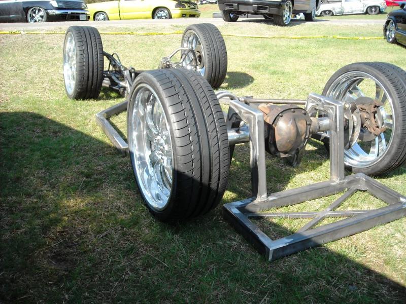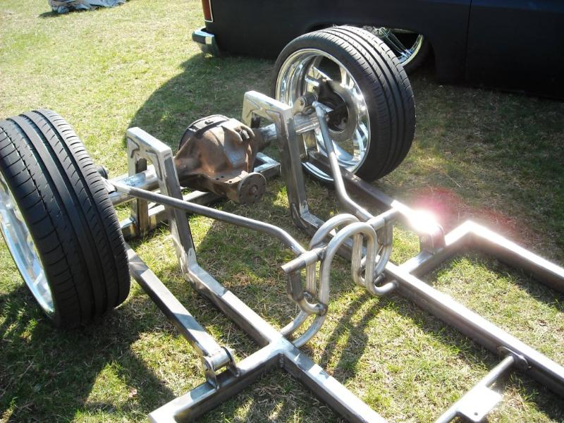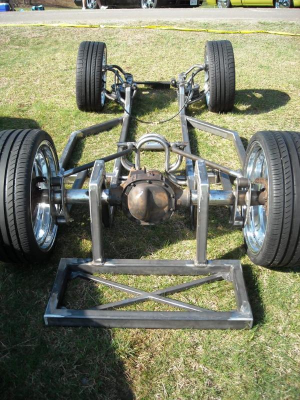 full chassis made by myself, uniballs in front, custom made control arms, suspension design done in autocad, 1 1/4" DOM 3/16 wall tubing used throughout. Rest of chassis is 2x3 3/16 wall, triangulated fourlink, 8.8 4.10 explorer rear end, toyota 2" drop spindles reamed and sleeved for bolt instead of ball joint, mustang II rack and pinion