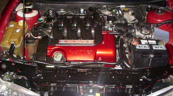 2.5L Duratec SVT. VM TB inlet, VM Short Ram Intake, Color Matched Engine Cover, Painted Radiator Sub-frame, Color Matched Fuse Box Top, Polished A/C Lines, Polished MAF sensor, 22" glasspack w/ 2.5" Dual exhaust w/ Powetone Tips.