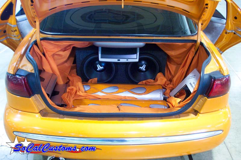 2 JL 12's, 2 alpine amps, 2 5.6 inch monitors in the headrest, a 7 inch in the console, a 14 inch in the truck