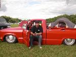 shaved gas filler door and antenna and hood squiters, wheel tubs front and rear, new flat red paint job and matching red bed liner