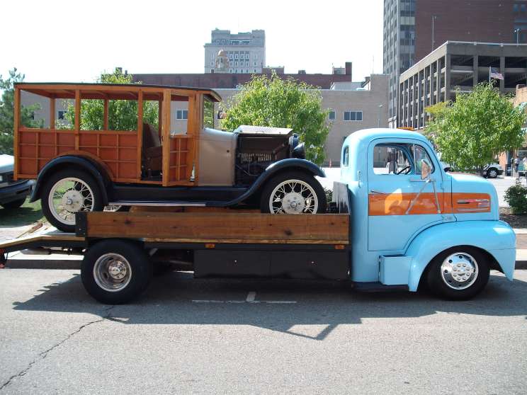 Cab was put on a late-model Chevy 1-ton frame. Body was dropped. Engine was relocated behind the cab in order to remove dog-box and create more interior room.