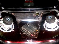 2-12" Alpine Type R subs, 6&1/2" Alpine Type R in the doors,2-6&1/2" Alpine Type R molded into a fiberglasses rear deck, pushed by 2 memphis 500w amps and a 250w memphis amp with a 1 fert cap, ran by a pioneer permier cd player with sub control