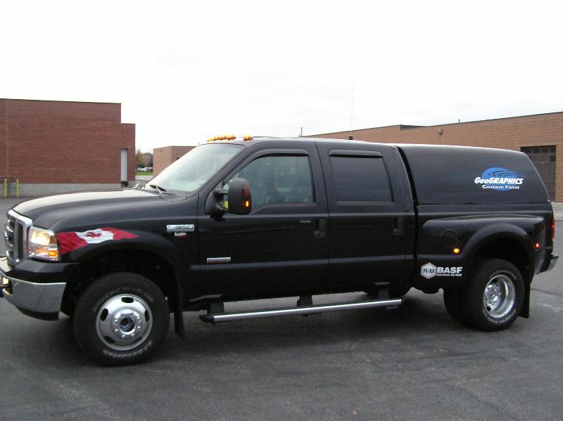 Truck Cap, "Big Rig" Mud flaps, Window vents, Company and Supporters Logos applied in vinyl, along with custom airbrushed Canadian Flags applied to vehicle.