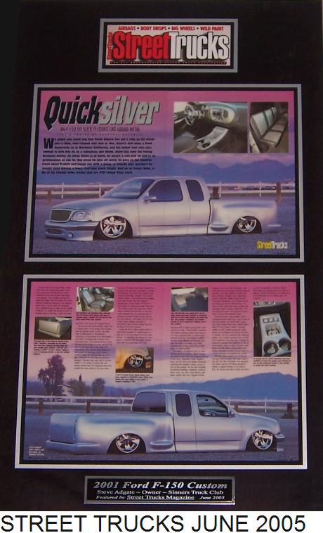 Shaved: Door handles,F150 side logos,Antena,Hood sprayers,compleet wiper crowl,(no wipers) tailgate, thrid break light, gas door tail lights now caddys..custom made roll pan, street scene mirrors, Harly lower valance, billet grills,dimond clear head lights and markers BED: molded every thing, look at the pic... Ect..Ect..Ect..Also one more thing, a 4.5" Stock floor body drop motha fuckaaaaaaa!
