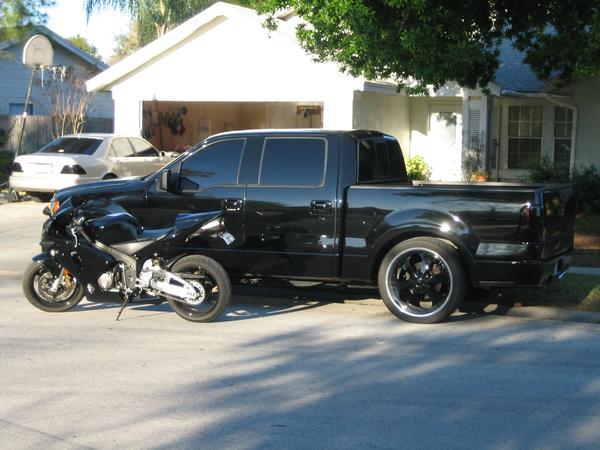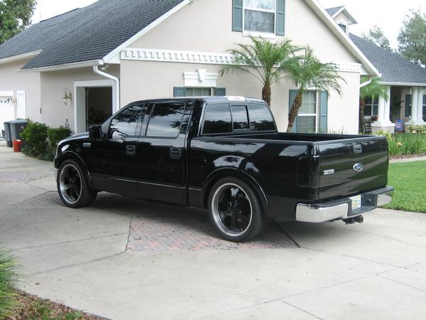 Black with smoked tail and 3rd brake lights, 06 F-150 Harley headlights, trenz upper and lower billet grill painted black, roush raceing front bumper, real smooth roll pan, HID 1000K headlights and 8000K fog lights, double 5% tint all the way around and 30% windsheild tint.
