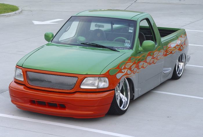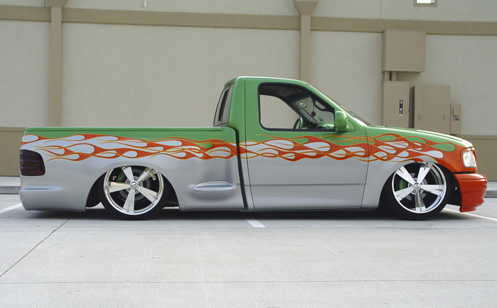 **FOR SALE**House of Color,tangelo flames with kandy orange ghost skulls inside of flames. Finished with yellow pin stripine seperating House of Color Lime Time Pearl and color matched stock silver. Shaved doors, tailgate, fender emblems,antenna,gas door, Molded Sir Michales roll pan. Street Scene smooth steps .....SOUTH COAST KUSTOMS...SOUTH HOUSTON TX..713-946-2747 WWW.SOUTHCOASTKUSTOMS.COM