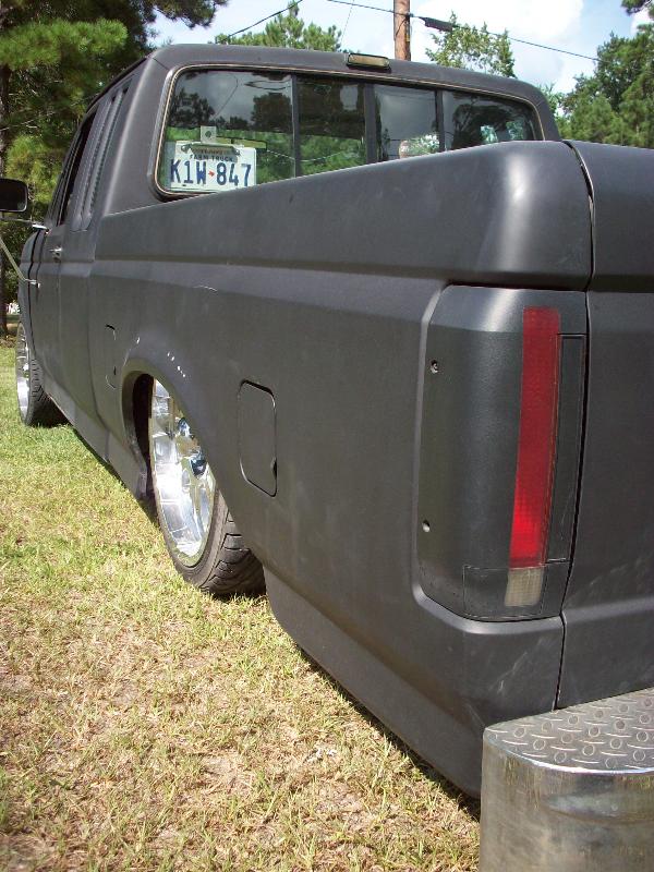 shaved tailgate and logos, flat black, famous ford logo, license plate in back window