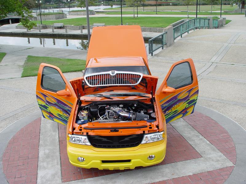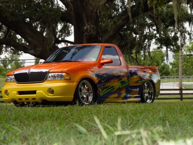 2002 Lincoln navigator front end,shaved door handles,rounded top of doors,smooth side bed steps,smooth bed rails,ground effects kit molded in,rear tail gate smoothed out,rear tail gate swings out,1995 Lincoln mark8 tail light molded in,and custom paint by Kal