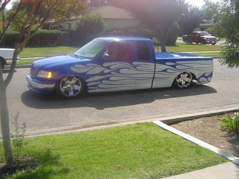 shaved doors gas door bed rails taligate and a snug top bed cover tailgate molded shut rollpan taillights shaved 15 inch leds antanne sheet metal bed HOK true blue pearl and pear white i would like to thank the guys at kaotic kustoms in reedley cali