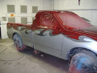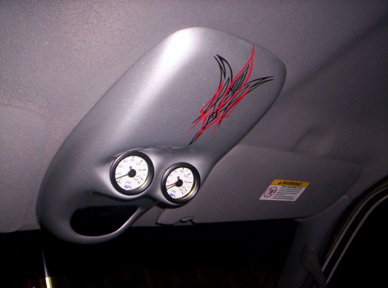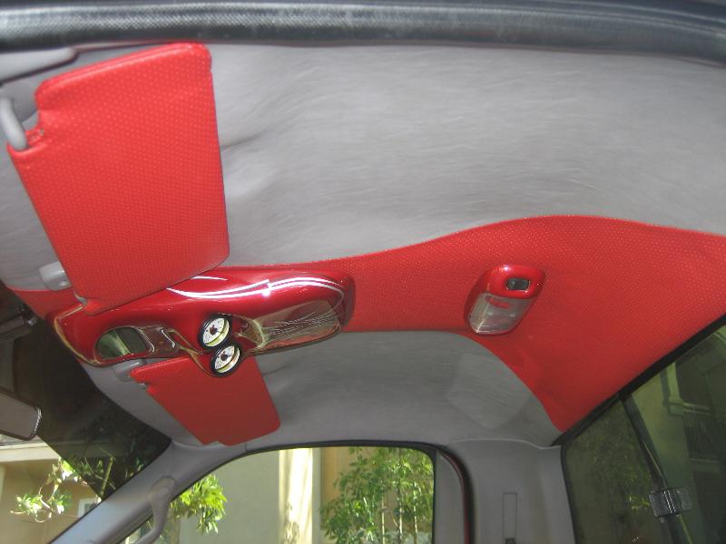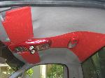 billet steering wheel, chopped seats, everything painted and covered in red, and gray
