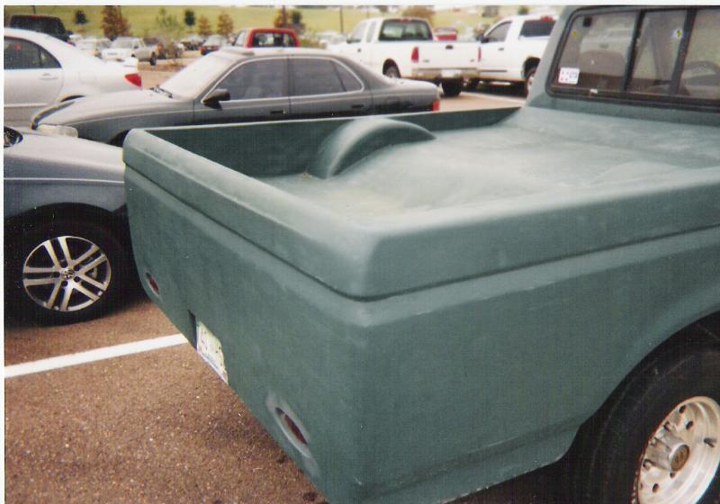 primer, shaved:drip rails, antenna, emblems, both gas filler doors relocated to underneath sheet metal med, stakepockets, taillights, roof seams, the stock bed floor was cut out and replaced with a bunch of 1x1 and 16 guage sheetmetal over it with tubs welded in. tailgate reskinned, 1949 ford taillights frenched in (which are actually upside down compared to the way they came on the car in 49) tailgate welded shut. all metal was hand fabricated including the buckets for the lights to sit in.