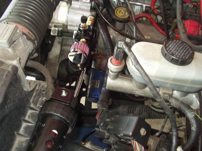 Stock 302 with GT-40p heads and K&N air filter. Made A/C compressor into air compressor for bags.
