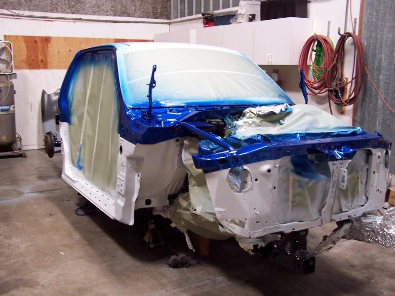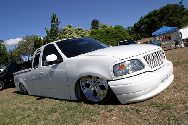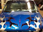 molded on tail, raised bed floor, sick ass one off bumper by bob grant. paint:ford white.dupont vivid blue effect. Flames: black traditional, overlayed with ghost chrome, spun to make it look like spun aluminum, flame work done by cosmic airbrush.