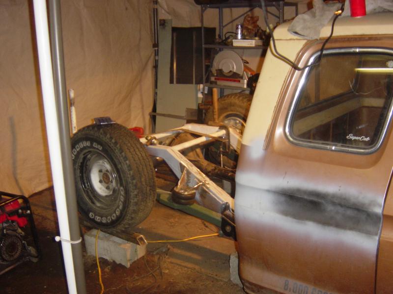 79 chevy rearend(5-lug and more narrow) 2-link with a drag link, 3/4 frame, 79 chevy x-member and front suspension between modified and narrowed ford rails, front frame also z'd 2 1/4 inches, slam bags, gc 1/2 valves, 12 gallon tank, york