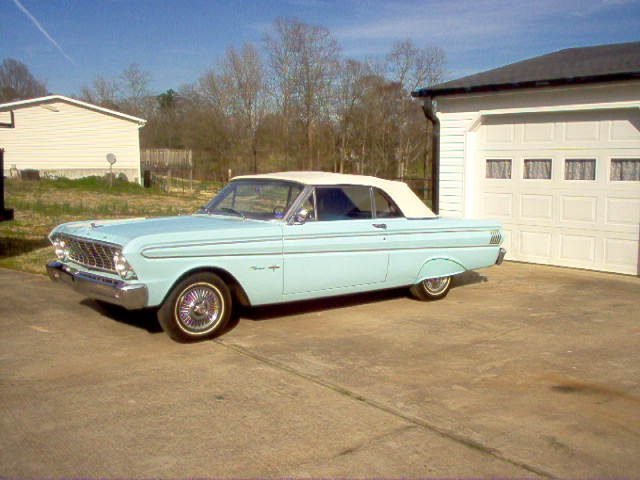 SKY LIGHT BLUE WITH A WHITE CONVERTIBLE TOP.FITTED WITH SOME FENDER SKIRTS.