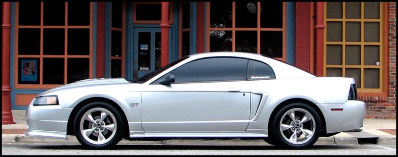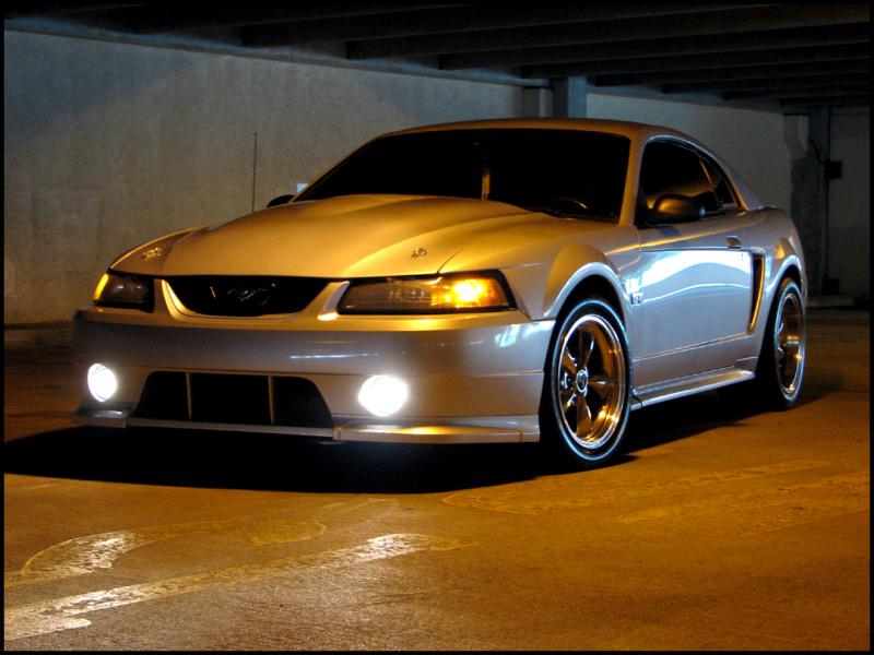 Roush front fascia, Kaenen Cobra R hood, Steeda hood pins, shortie antenna, shaved trunk holes, shaved 3rd brake light, shaved trunk key hole, 05 GT emblems, black out taillight tint