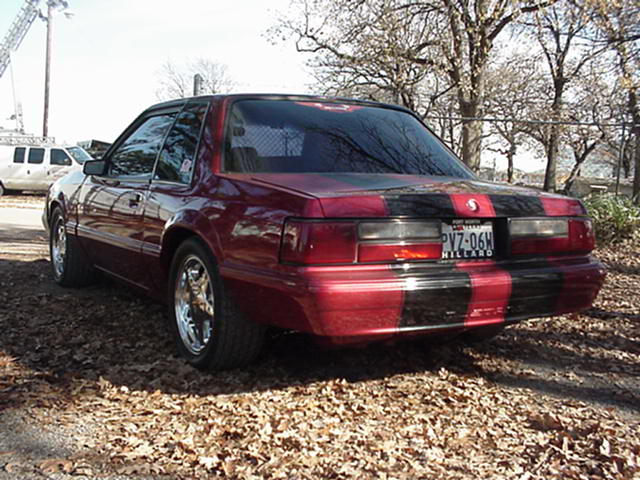Strawberry metallic with black pearl racing stripes. The stripes go over the core support, under the hood, down the firewall, through the headliner, under the trunk lid. Everywhere the stripes follow