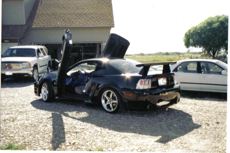 jet black lambo doors, kaminari full body kit, painted to match mack 2 hood painted to match cobra r wing painted to match rear lights projector head lights full street glow undercarage neon kit its blue to match interior, stainless mustang name in rear, custom break light reads out last name,