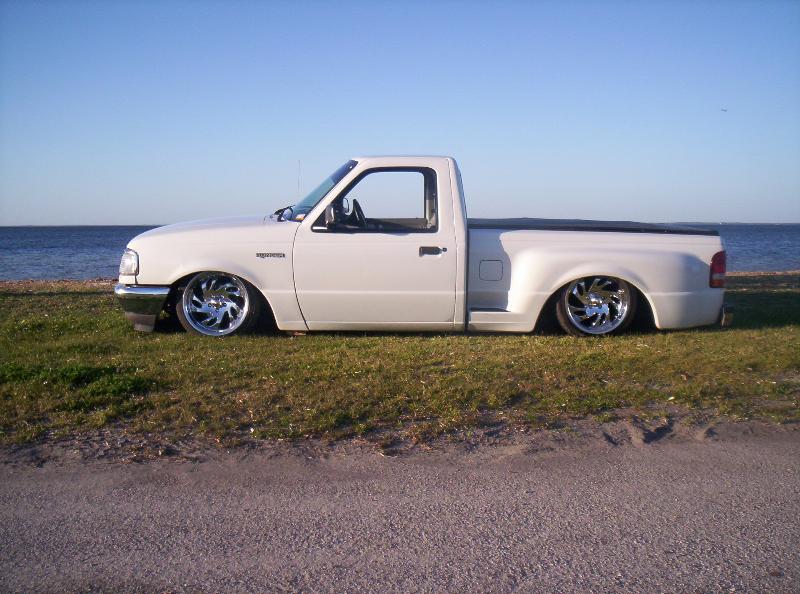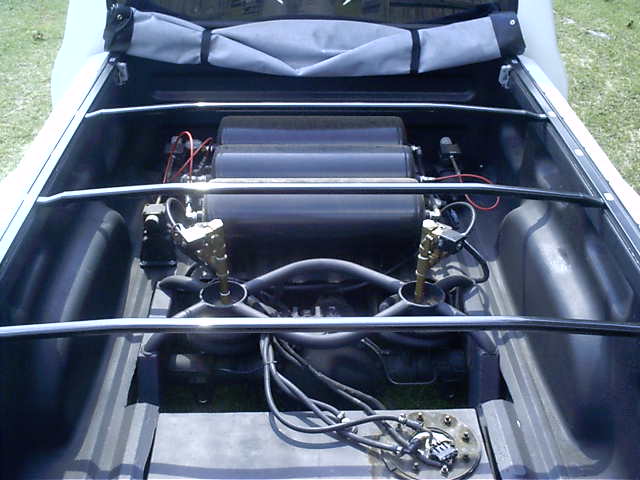 Firestone bags in the front, Conitech (sp?) in the rear, three 5 gallon tanks and three firestone compressors. Parallel 4 link, no shocks, WOO! Suspension is getting a major face life..just need to get some days off of work.