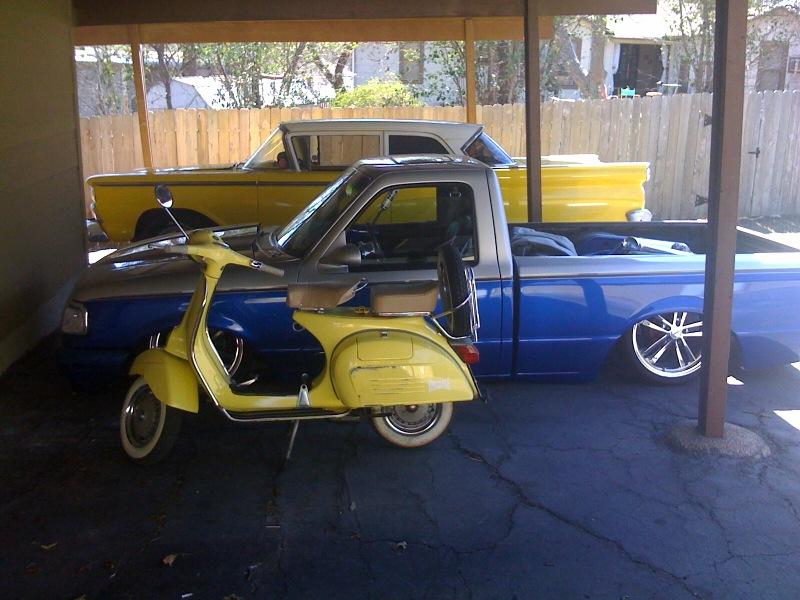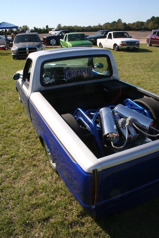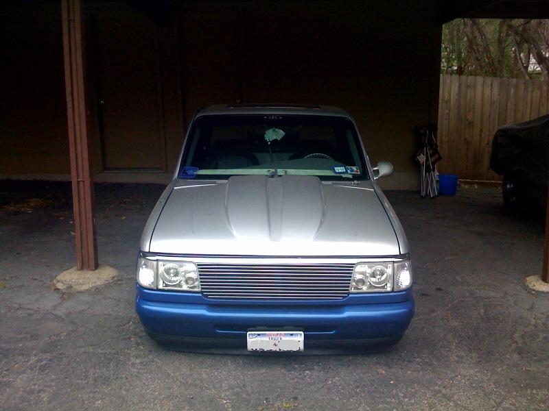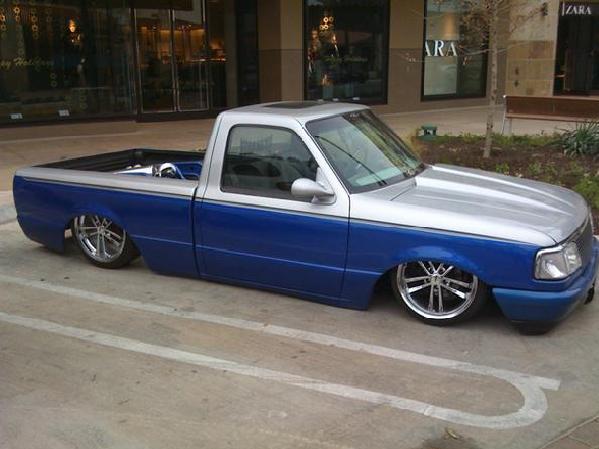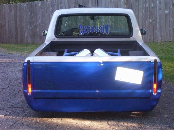 Shaved: Antenna,handles, third brake light, upper cab seam, molded in roll pan, tailgate. Frenched in Cadillac tail-lights. HID true projection headlamps. Custom 2 tone paint.Custom mixed PT Cruiser blue / Silver