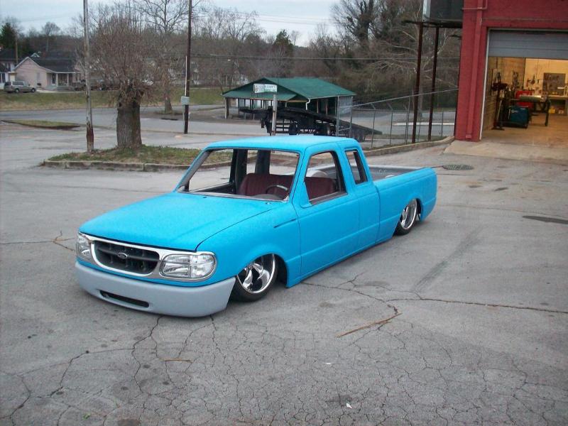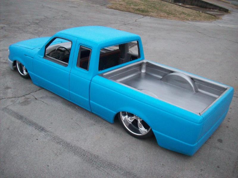 One off front bumper using Explorer parts, Explorer front end conversion, Thunderbird fender vents, shaved bodyline in front of vents, fully shaved cab, smoothed back cab wall and front bed wall with custom skins by Grant Kustoms, tilt bed, full sheetmetal bed with functioning tailgate, shaved tailgate, shaved taillights and rollpan using Grant Kustoms products