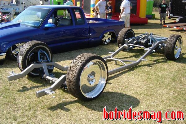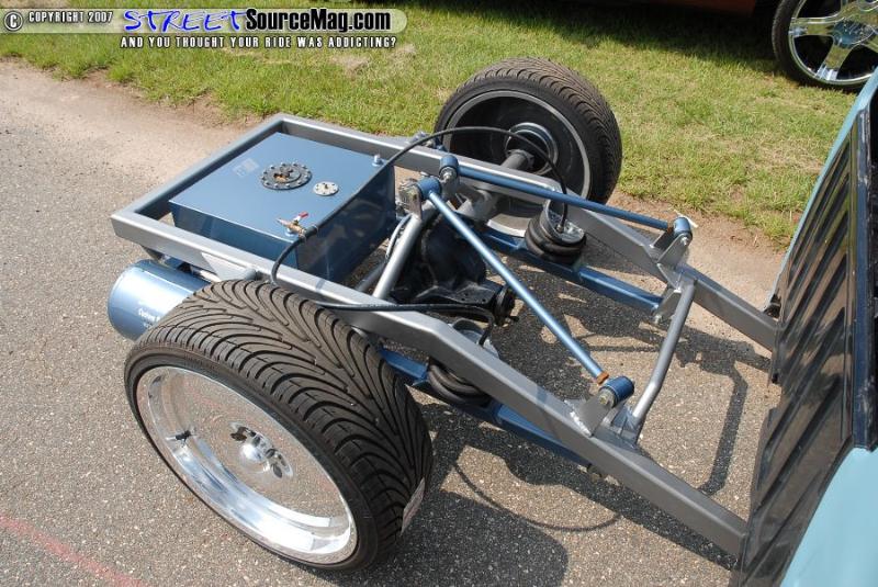 Bumper to bumper 2x3 frame, one off front suspension using Toyota spindles and a Mustang rack, Triangulated 4 link, Rear suspension and front suspension changes by Little Shop of Horrors
