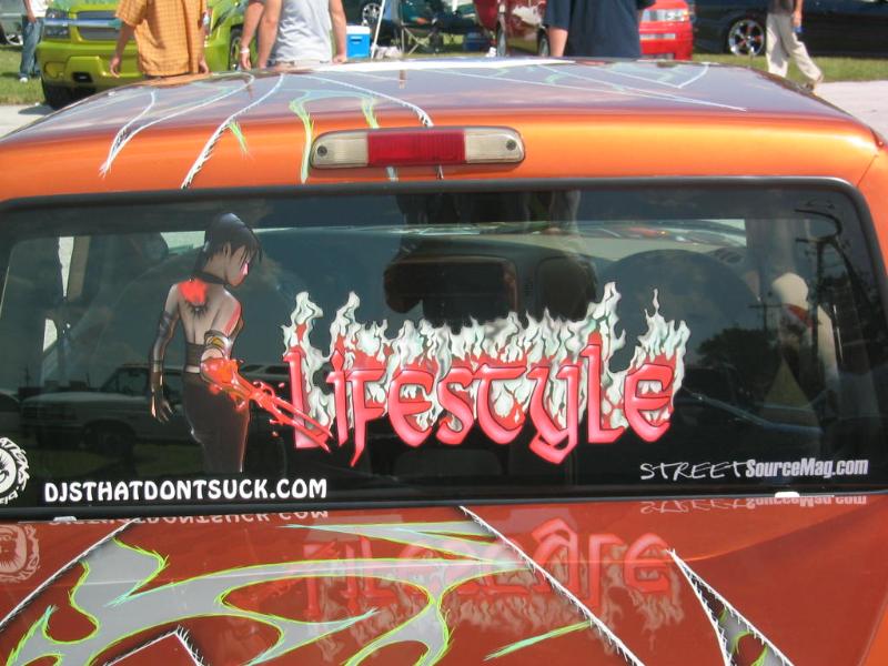 orange with custom gfx and insane custom bed with gfx and a gfxed topper laser cut free standing flames shaved tail gate handle tag box molded roll pan shaved gas door